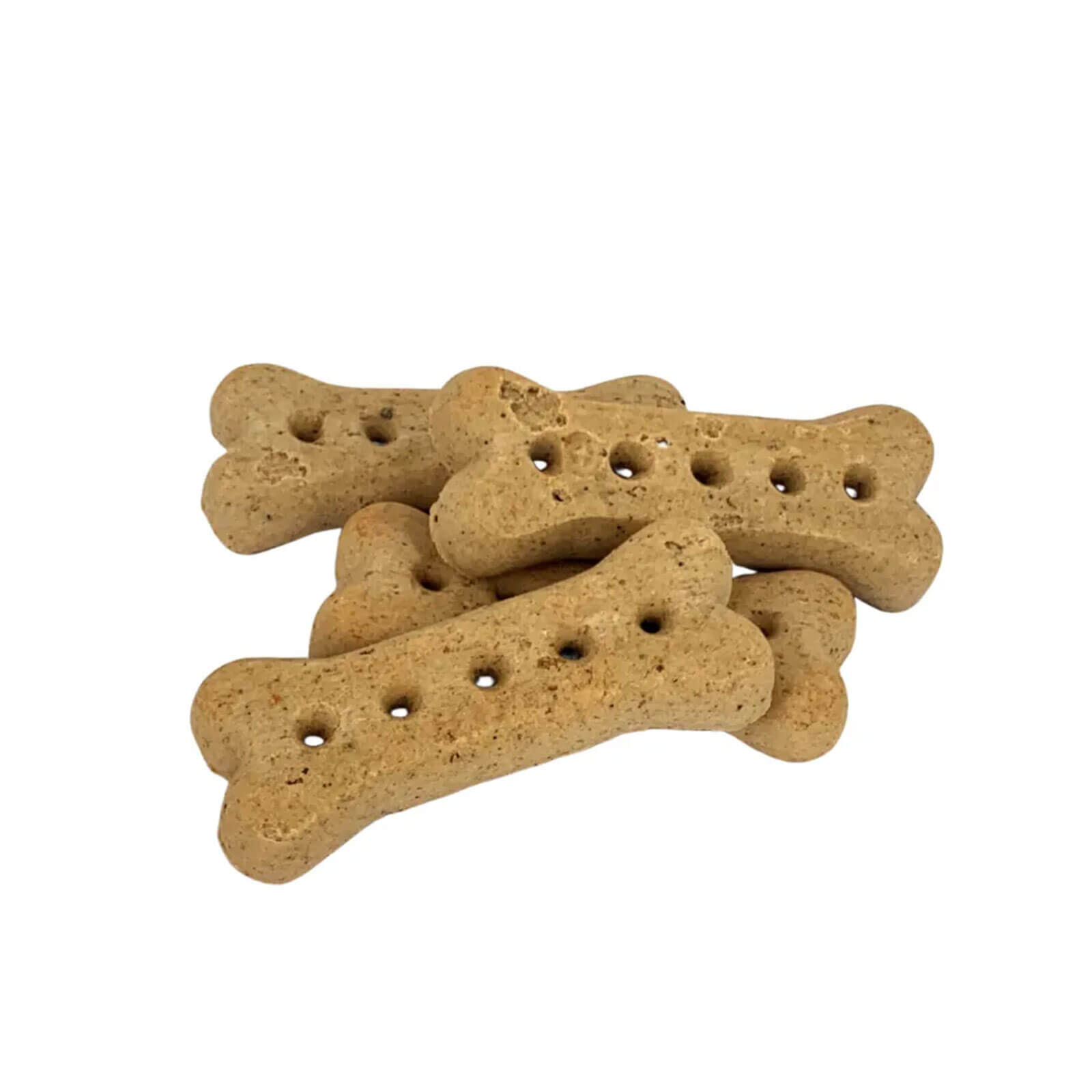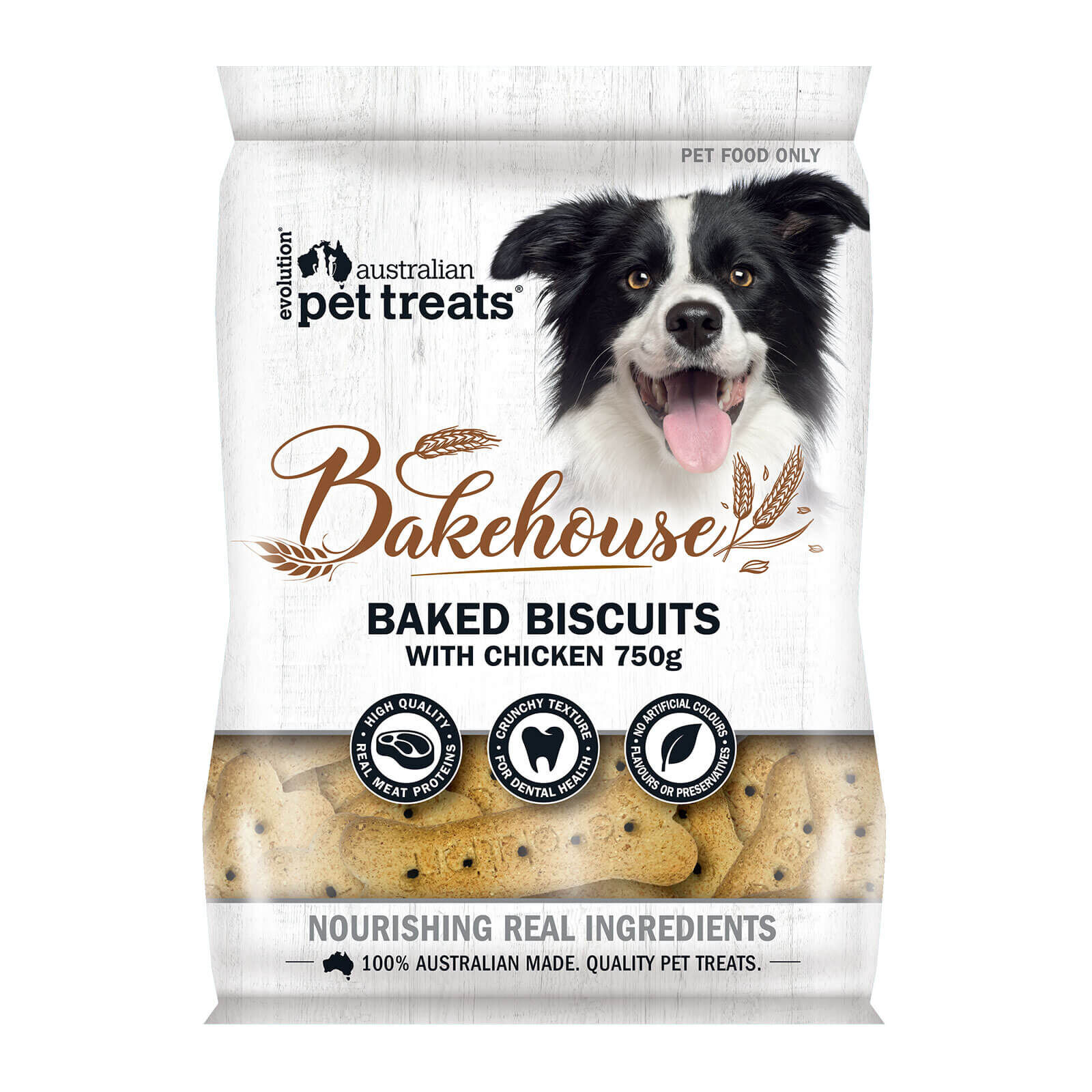 This is a 750g pack of Bakehouse Biscuits - Chicken. Bakehouse biscuits are naturally oven baked, and have a great crunchy texture to assist with tartar control. Keep a pack of these dog biscuits in your cupboard for anytime your dog deserves a flavorful reward, or anytime you want to get his tail wagging for a delicious snack. As an added bonus – the crunchy texture also helps to remove plaque and tartar build up and clean your dog’s teeth as he chews. These baked dog treats are suitable for dogs of all shapes and sizes.
