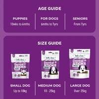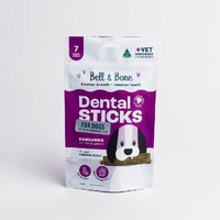 This is a Bell & Bone Kangaroo Mint & Turmeric Dental Sticks Dog Treats. With 2 active ingredients, scientifically proven to reduce plaque and tartar, our Kangaroo, Mint & Turmeric Dental Sticks will help freshen breath and fight plaque and tartar when given daily. These Kangaroo Dental Chews and Dog Treats are perfect to keep your dog's teeth clean and their breath fresh. 7 Sticks per pack - different size sticks for different size dogs. Grain and filler free. Unique 3 pronged shape to encourage chewing.