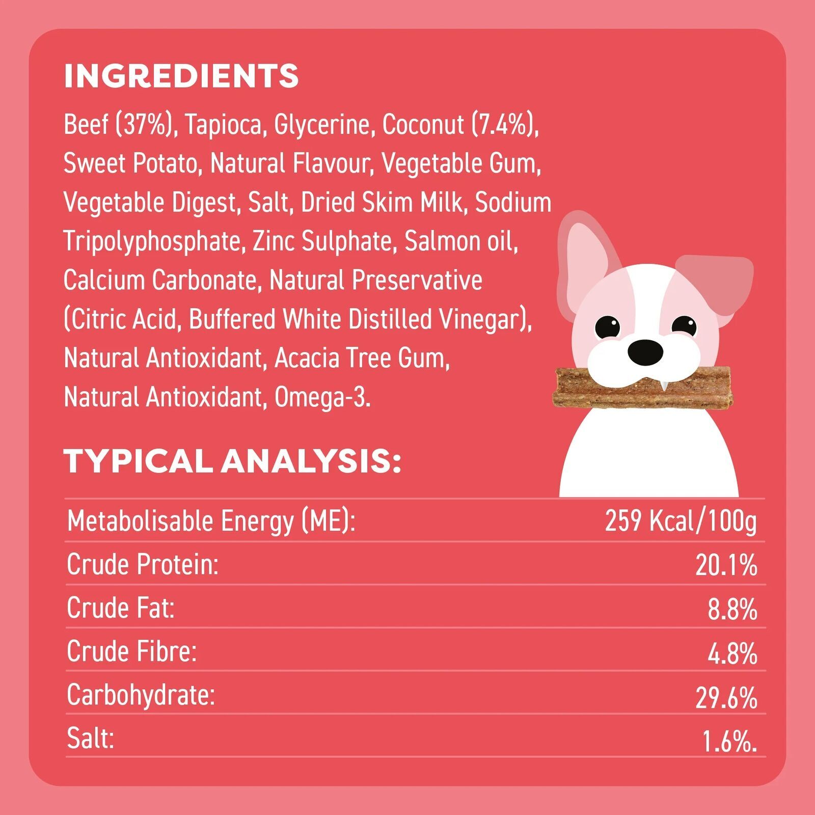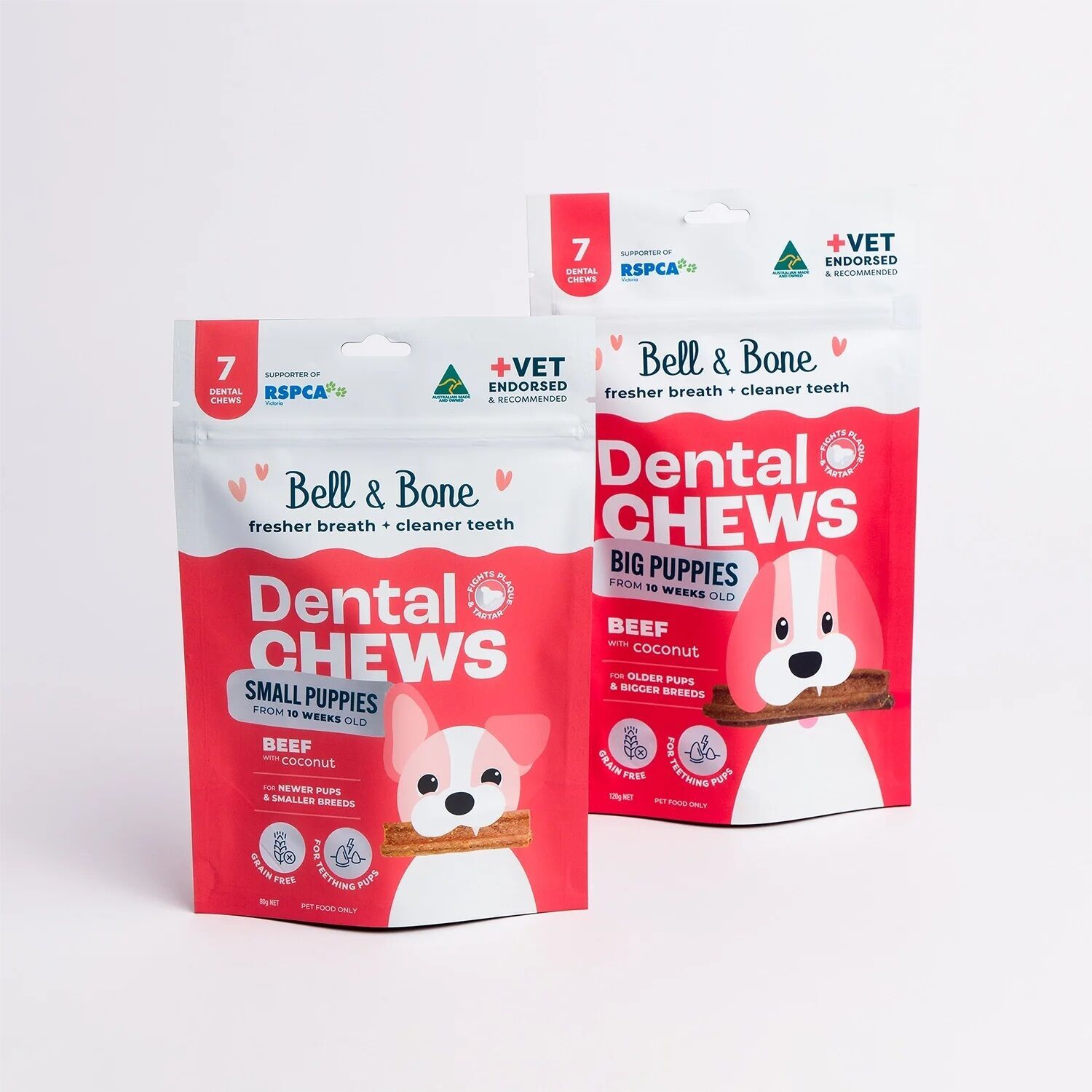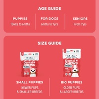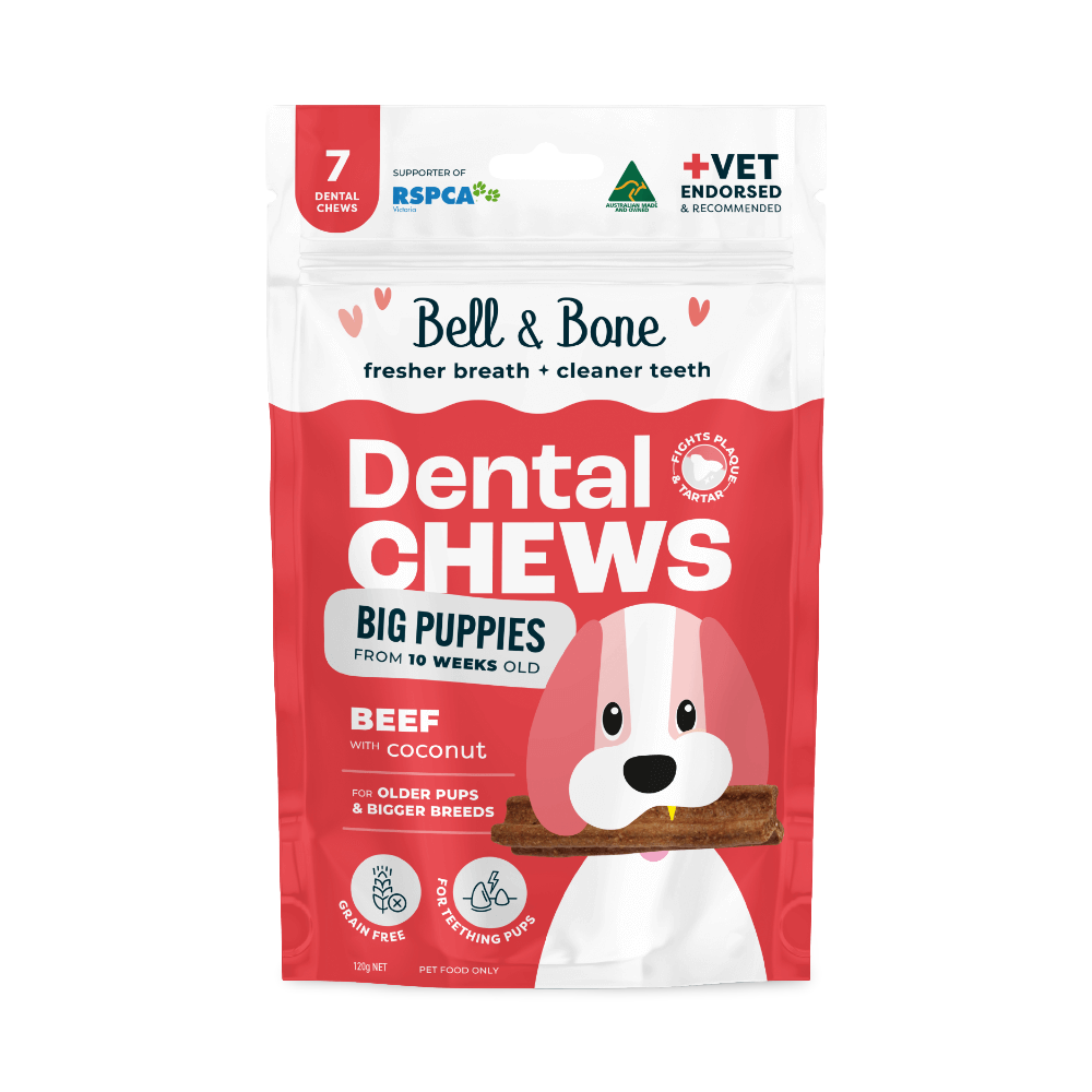 Bell & Bone Beef and Coconut Puppy Dental Chews have been designed specifically to support your puppy’s overall oral care and alleviate the risks of dental disease as they age. Promoting healthy chewing habits, with their unique 3-pronged shape, and with the support of active ingredients.