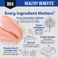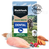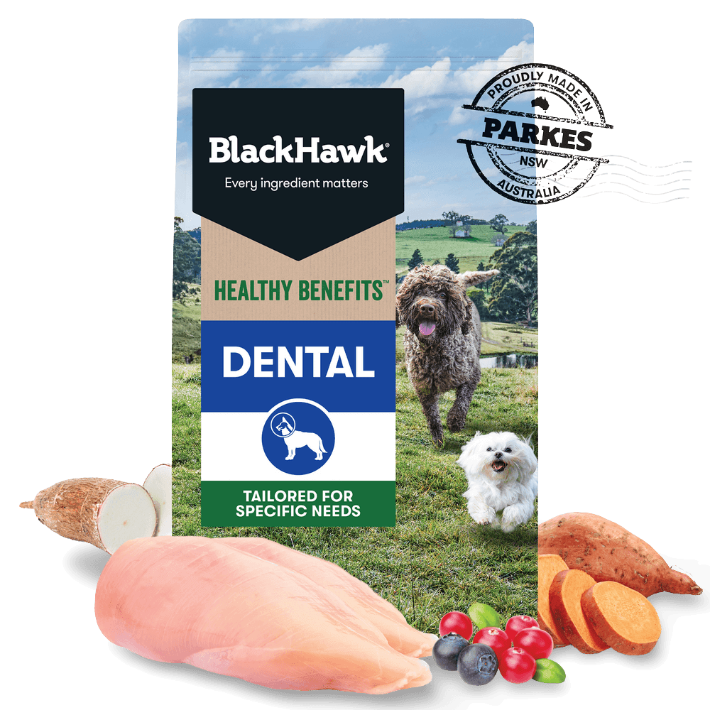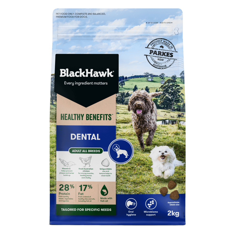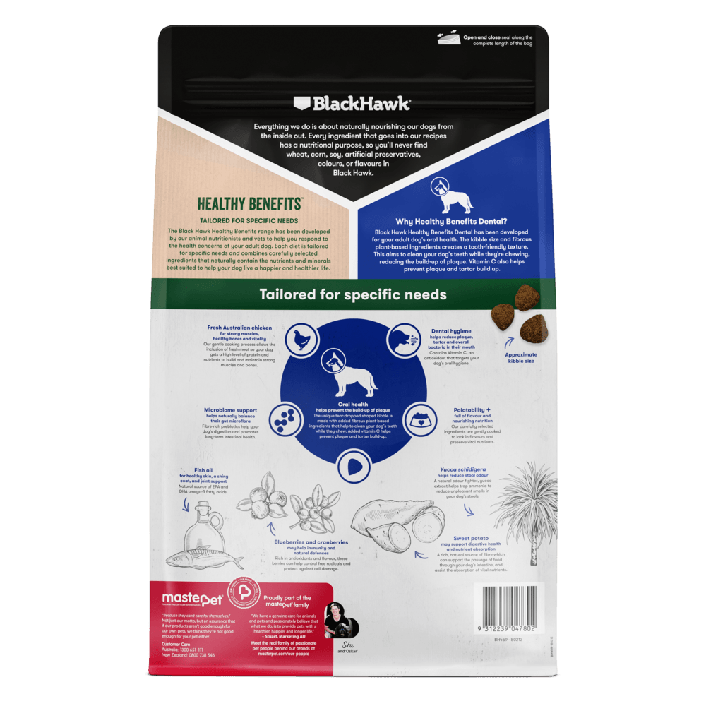 Black Hawk Healthy Benefits Dental is a complete and balanced dry dog food developed to support your adult dog's oral health. The unique teardrop shaped kibble is packed with plant cellulose and Vitamin C to help mechanically clean teeth, reduce plaque and tartar, and stimulate saliva production to help neutralise acid. Contains fish oil for healthy skin and coat. No artificial preservatives. Made in Australia by pet nutritionists and vets.