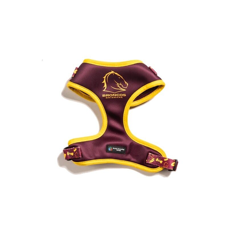 This is a NRL Brisbane Broncos Nylon Dog Harness for Walking. Introducing the new Brisbane Broncos NRL dog harness. Available in sizes from X-Small all the way to X-Large, check the size guide to find your pawfect fit. Printed with your teams colours on a high quality neoprene for smaller sizes and canvas for large sizes, your pup can support your favourite team with you. Chest and neck straps are adjustable to ensure the harness always fits your dog perfectly. Neoprene with a breathable mesh lining. Quick drying material after washing. Fully adjustable polyester webbing neck and chest straps. Back D ring for regular walking. Also includes a front D-Ring for no pull walking (only available on our Large and X-Large harnesses). Official NRL Merchandise.