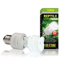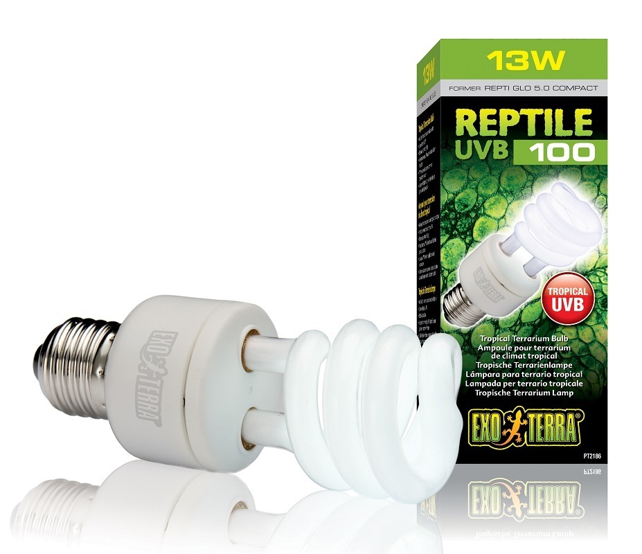 This is an Exo Terra Reptile UVB 100 (Repti Glo 5.0 Compact Fluorescent) - Tropical. The Exo Terra Reptile UVB100 emits optimal levels of UVB, similar to that of shady environments such as rain forests or other tropical locations. Reptiles living in these habitats receive moderate UV radiation due to climatological conditions (fairly high humidity, changes in weather, etc) that prevent unfiltered sunlight from reaching the reptile’s basking site. The optimal Vitamin D3 yield index ensures vitamin D3 photosynthesis to aid calcium absorption and prevent metabolic diseases.