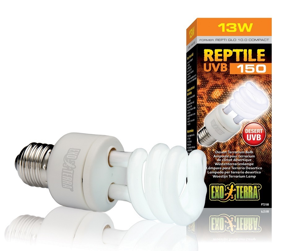 This is a Exo Terra Reptile UVB 150 (Repti Glo 10.0 Compact Fluorescent) - Desert. The Exo Terra Reptile UVB150 has a very high UVB output similar to sunlight in deserts. These locations receive more direct sunlight, therefore desert reptiles are more exposed to UV radiation than any other type of reptile. This bulb can also be used on terrariums with denser screen covers to ensure sufficient UVB penetration. Dense screens can filter out up to 50% of the UVB rays. The high Vitamin D3 yield index ensures vitamin D3 photosynthesis to aid calcium absorption and prevent metabolic diseases.