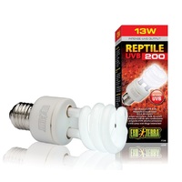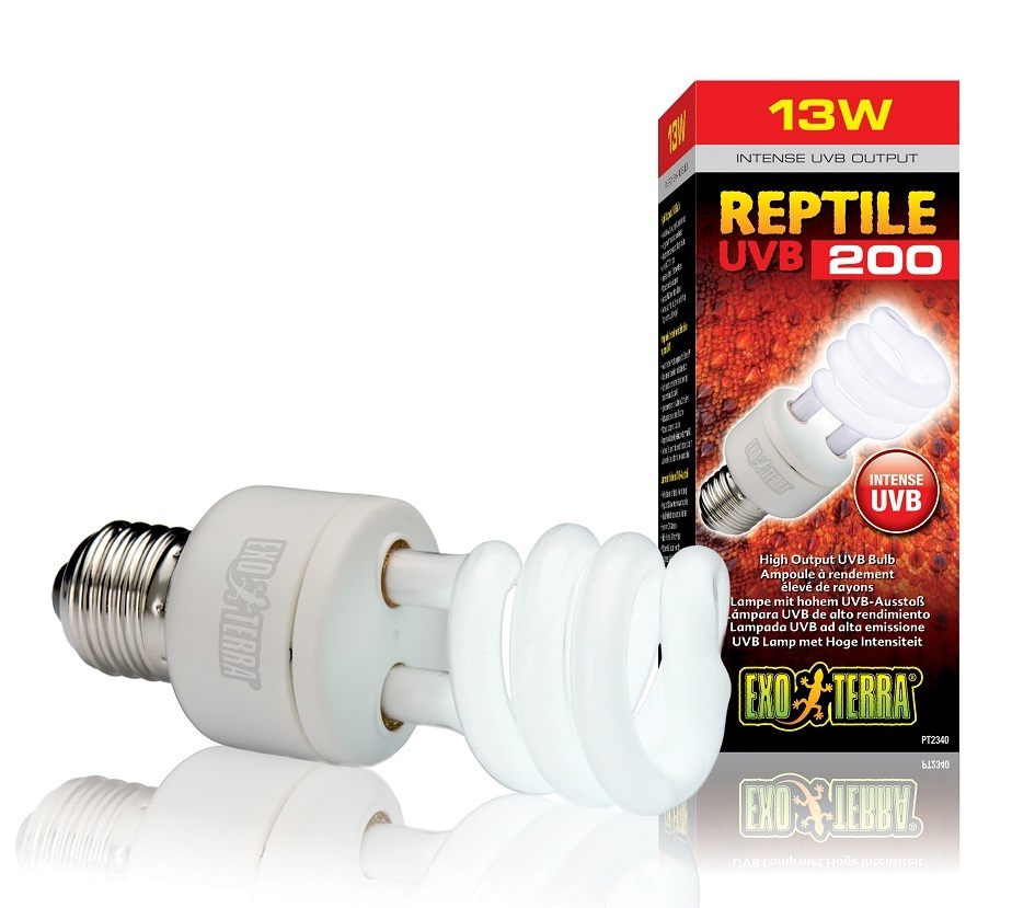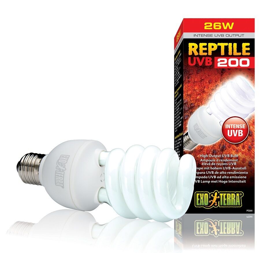 This is a Reptile UVB 200 Compact Fluoro Bulb by Exo Terra. The Exo Terra Reptile UVB200 emits the ideal UVB spectrum for optimal Vitamin D3 photosynthesis. The Reptile UVB200 Bulb is especially designed to simulate conditions for reptiles with very high UV requirements, like diurnal reptiles from desert environments. These areas receive direct unfiltered sunlight with high levels of UVB. The significantly high Vitamin D3 yield index results in increased vitamin D3 photosynthesis to aid calcium absorption and prevent metabolic diseases. The extended UVB penetration makes this bulb the ideal choice for taller terrariums or terrariums with denser screens.