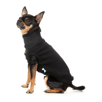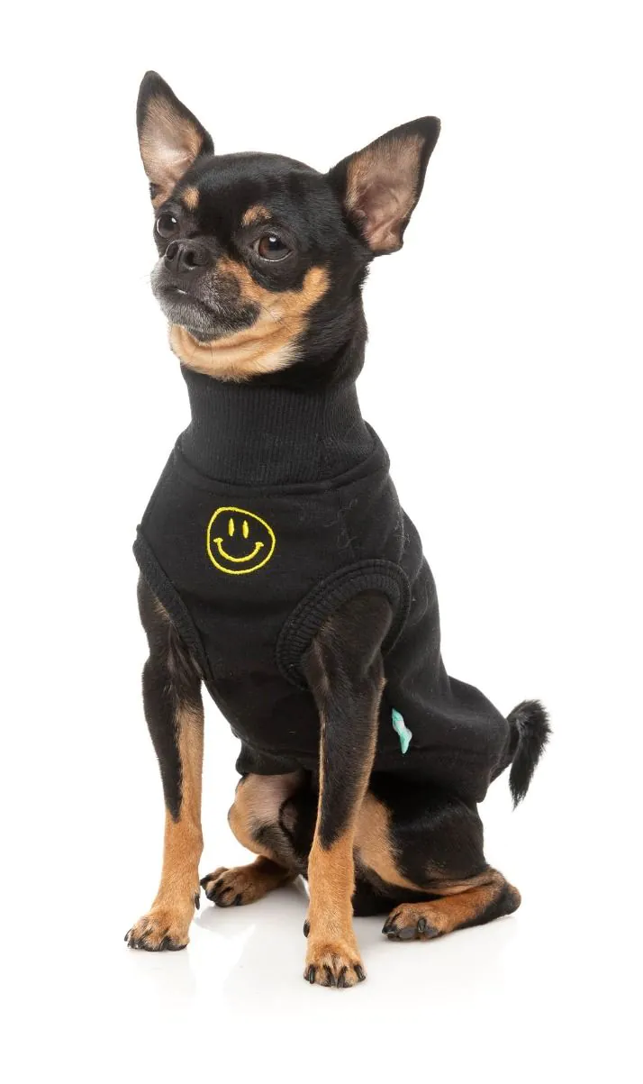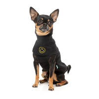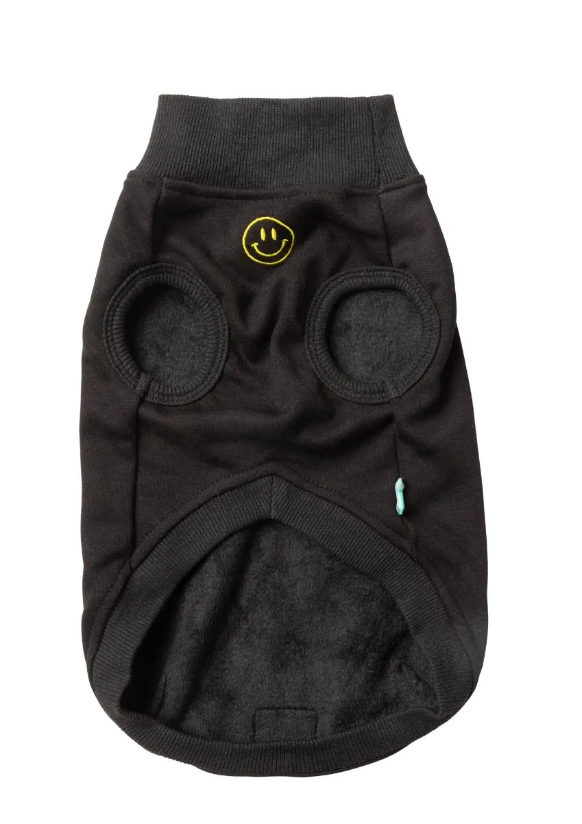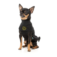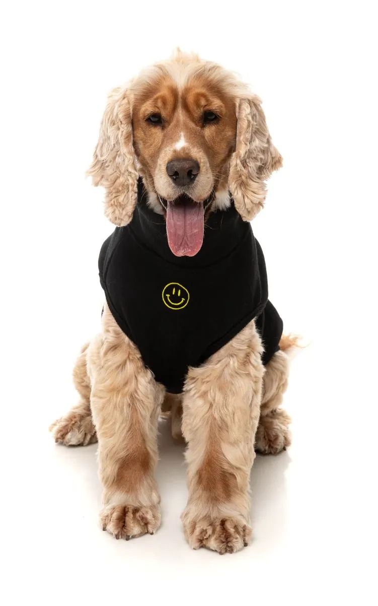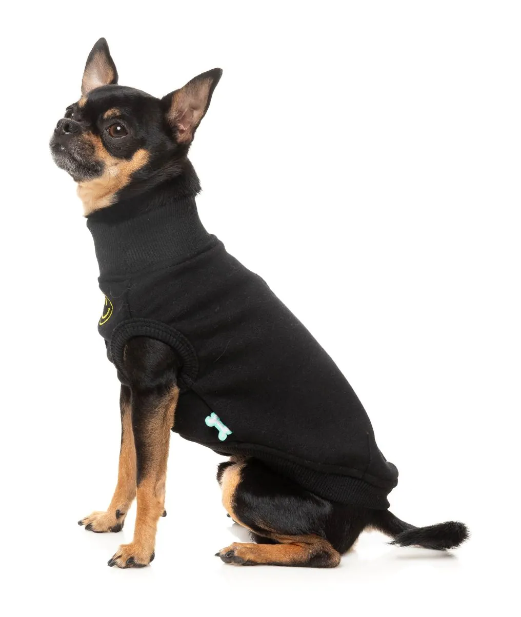 This is a Smiley Black Dog Sweater by Fuzzyard. Bring a dose of joy to your pet’s wardrobe with the Smiley sweater! Featuring signature velvety-soft 100% cotton fleece and a playful embroidered smiley on the chest, this piece is designed to make every day a little brighter. With ribbed details and a harness hole for easy wear, the Smiley sweater combines warmth and personality. Available in Black, Rust, and Navy—perfect for pets who love spreading smiles wherever they go.