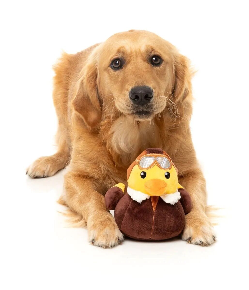 This is a FuzzYard Waddle Squaddle - Amelia Quackhart - Small. Prepare for takeoff with the legendary, Amelia Quackhart! Donning her best aviator gear, complete with a snazzy collared jacket and goggles, Amelia Quackhart is ready to lead your canine companion on sky-high adventures. She’s the pawfect co-pilot to get those propellers and tails spinning. What’re you waiting for? It’s time to take to the skies (or just the living room) and fetch your own Amelia Quackhart today!