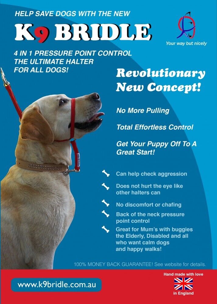 There is a strap under the chin. It is there as a safety device. Should the unthinkable happen and your dog managed to get the bridle off, you are still attached to your dog. The K9 Bridle works on a principal similar to a bit-less bridle for horses, so if that will stop a horse it can also stop a dog. When the lead is tightened, pressure is applied to the front of the face and tells the dog “NO”. The dog easily understands this clear and precise command. He soon learns that when he moves forward from the ‘heel’ or ‘close’ position the bridle will apply slight pressure and remind him where he should be. The command given through the lead should be small tweaks on the lead NOT a pull. Pulling will initiate the “flight or fight” response in your dog. You must not get into a fight with him or make him afraid of the headcollar. It is very much a command and instant reward scenario. You give the small command, he responds and you instantly reward that response with a slack lead. While the dog is at “heel” the lead should always be slack, and applying no contact whatever.