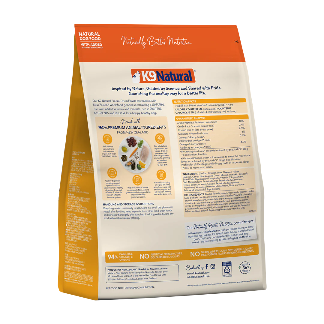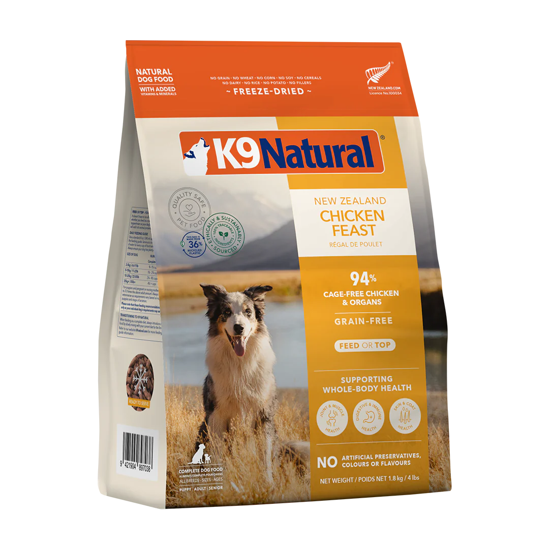 This is a K9 Natural 1.8kg Chicken Feast Grain Free Freeze Dried Dog Food. Our complete and balanced Freeze-Dried New Zealand Chicken Feast contains 94% Cage-Free Chicken and Organs with New Zealand Green Mussels, Flaxseed Flakes, Vegetables, Oils, Kelp, Vitamins, and Minerals in support of your dog's whole-body health.