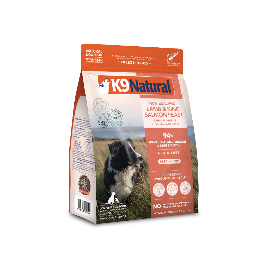 This is a K9 Natural 500g Lamb & King Salmon Feast Grain Free Freeze Dried Dog Food. Our complete and balanced Freeze-Dried New Zealand Lamb & King Salmon Feast contains 94% Grass-fed & Grass-finished Lamb & Organs, and Sustainably-caught King Salmon, with New Zealand Green Mussels, Flaxseed Flakes, Vegetables, Oils, Kelp, Vitamins, and Minerals in support of your dog's whole-body health.