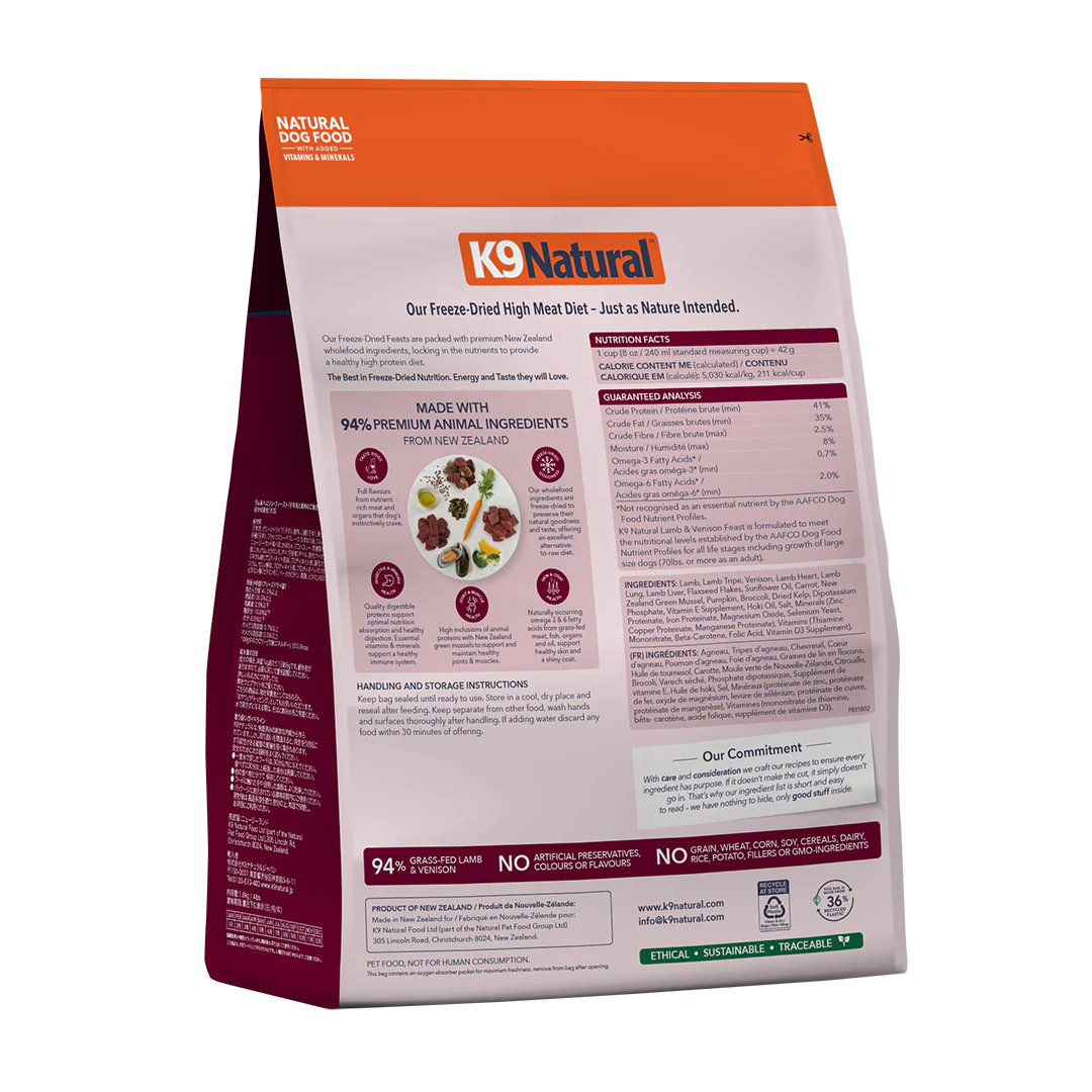 This is a K9 Natural Dog Food - Lamb & Venison Feast - 1.8kg. Our complete and balanced Freeze-Dried New Zealand Lamb & Venison Feast contains 94% Grass-fed & Grass-finished Lamb, Venison & Organs, with New Zealand Green Mussels, Flaxseed Flakes, Vegetables, Oils, Kelp, Vitamins, and Minerals in support of your dog's whole-body health.