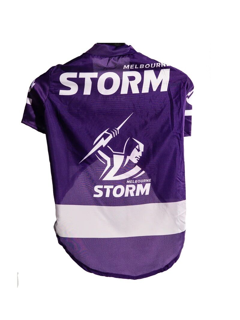 This is a NRL Melbourne Storm Dog Jersey Shirt. The Melbourne Storm NRL dog jersey is the perfect piece of dog merchandise for your teams newest supporter. Made with a light breathable material, you can add an extra layer of warmth all while supporting your beloved team. See size chart available to get the ideal fit for your pup. Professionally printed with dye-sublimation. Made from 100% breathable polyester. For cleaning, hand wash and hang to dry. Can be worn year round with a breathable material. Official NRL Merchandise.