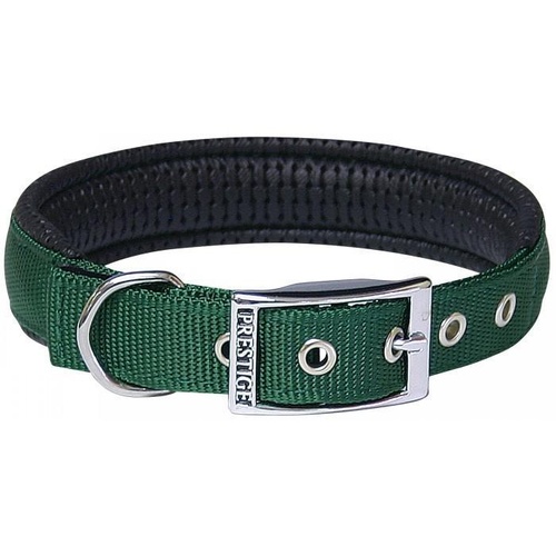 This is a Soft Padded Nylon Dog Collar Hunter Green by Prestige Pet. Unique black PVC foam padding provides the ultimate comfort for dogs wearing the Prestige Soft Padded Nylon Collars. Constructed from premium quality pliable nylon in a fabulous colour range. Chrome plated buckles are held in place by box stitching. Buckle holes are reinforced with sturdy metal eyelets. These collars are measured to the middle hole.