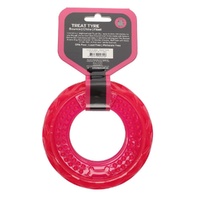 The Scream Xtreme Treat Tyre in X-Large Loud Pink is a tough, long-lasting chew toy built for extreme chewers. Made from Thermoplastic Rubber (TPR), it's lightweight, weather resistant, and virtually indestructible. Use it as is or fill the inside with paste for an extra challenge. It also floats, making it great for beach and pool play. Vanilla scented and dishwasher safe