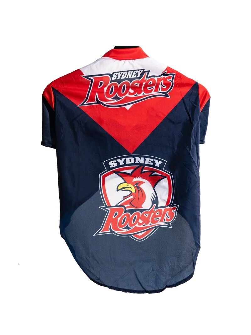 This is a NRL Sydney Roosters Dog Jersey Shirt. The Sydney Roosters NRL dog jersey is the perfect piece of dog merchandise for your teams newest supporter. Made with a light breathable material, you can add an extra layer of warmth all while supporting your beloved team. See size chart available to get the ideal fit for your pup. Professionally printed with dye-sublimation. Made from 100% breathable polyester. For cleaning, hand wash and hang to dry. Can be worn year round with a breathable material. Official NRL Merchandise.