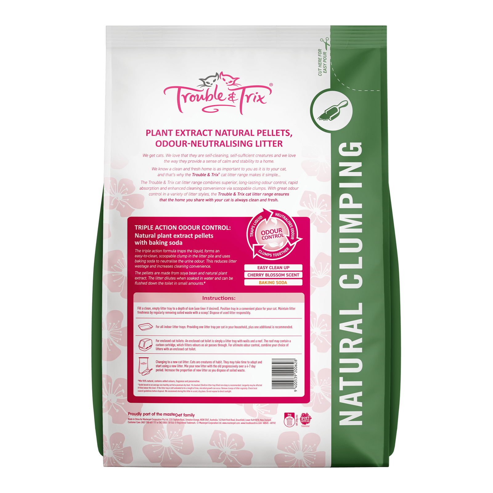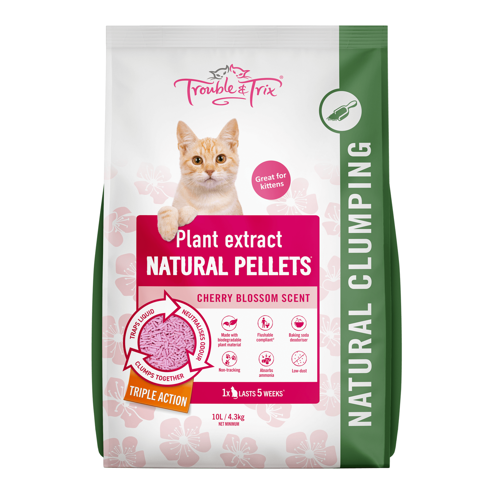 Trouble & Trix Natural Pellets Clumping Litter - Cherry Blossom Scent - 10L (4.3kg)
