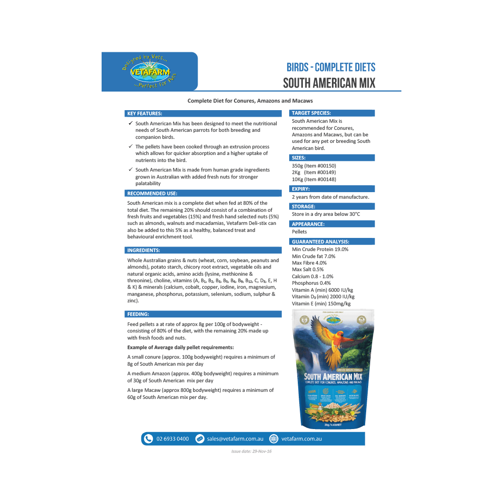 South American Mix was formulated by avian veterinarians to meet the nutritional needs of South American parrots for both breeding and companion birds. This product provides nutritional balance for growth, breeding, brain function and optimum feather development when fed at 80% of the total diet. The remaining 20% should consist of a combination of fresh fruits and vegetables (15%) and fresh hand selected nuts (5%) such as almonds, walnuts and macadamias.