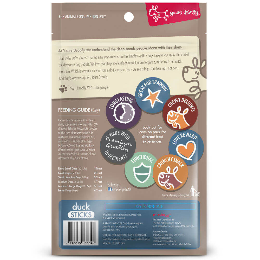 This is a Yours Droolly Duck Sticks - 110g. These duck sticks are deliciously tempting treats for dogs of all ages. Made from all-natural ingredients, these healthy soft duck sticks are made from real Australian duck breast and provide your dog with a yummy reward packed full of natural goodness.