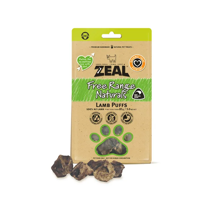 This is a Lamb Puffs 85 gram Free Range Naturals Dog Treats by ZEAL. ZEAL 100% Pure Natural pet treats are wholesome, trustworthy and traceable to source. They are handmade at an Auckland factory from premium New Zealand free range meats and wild caught seafood. Absolutely NO colourings, flavours, additives or preservatives are used in the manufacturing process. Treat your pet with a tasty and healthy source of nutrients.